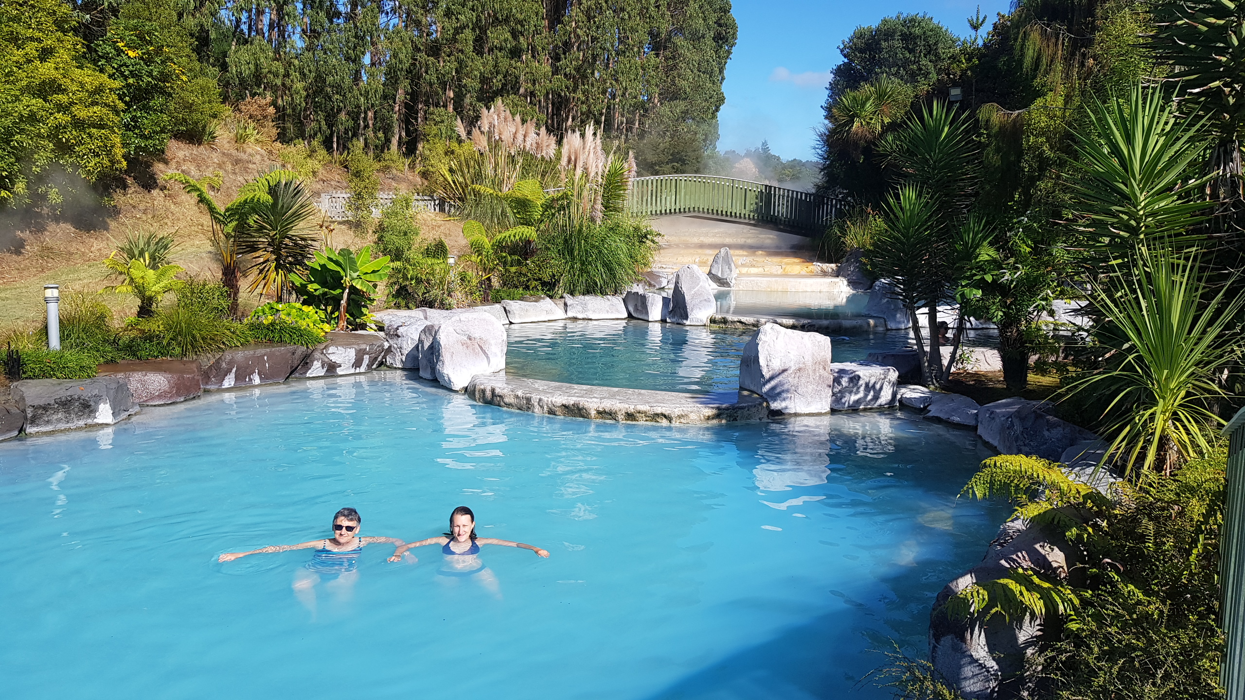 Lendemain de trek, après une bonne nuit de sommeil, rien de mieux qu’un petit passage par les eaux thermales pour bien récupérer. Nous nous rendons au Wairakei Terrasse pour nous prélasser une bonne heure et demi dans les bains d’eau chaude remplis de minéraux en tout genre bons pour la santé.